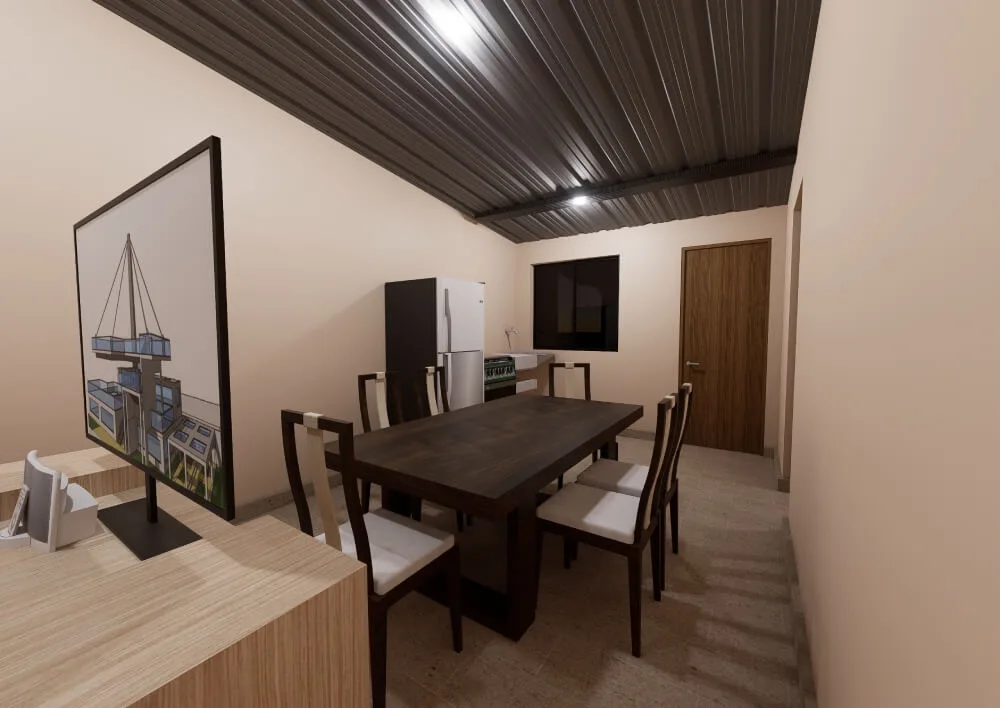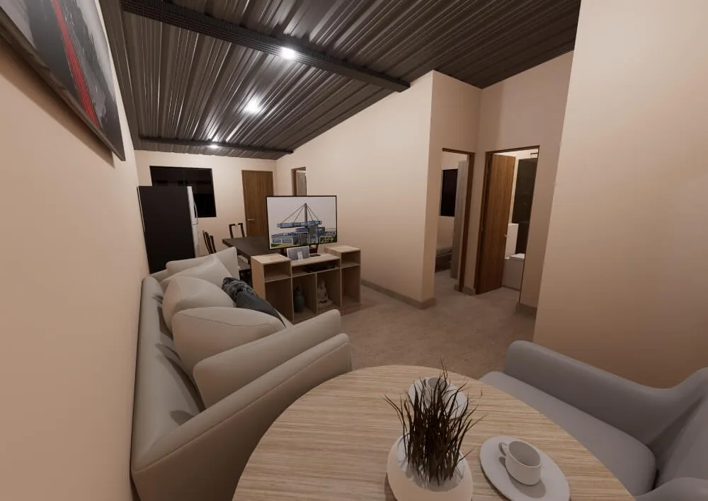 El diseño incluye una sala-comedor integrada que aprovecha al máximo el espacio, creando un ambiente cálido y versátil para compartir, descansar o recibir visitas. La cocina funcional permite realizar las tareas cotidianas con total comodidad, manteniendo un estilo moderno y ordenado.